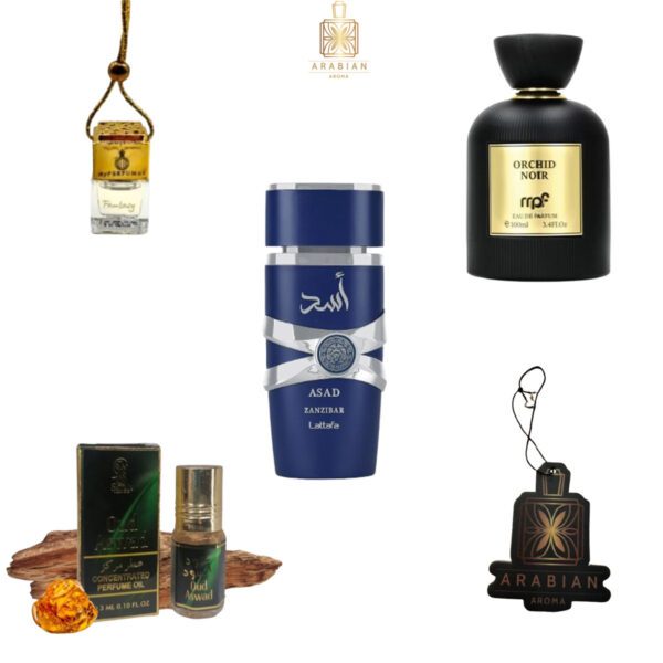 My Perfumes Orchid Noire | Lattafa Asad Zanzibar | Мини парфюмно масло |My Perfumes Fantasy Ароматизатор за кола | Arabian Aroma – Ароматизатор за кола (Sweet Vanilla)